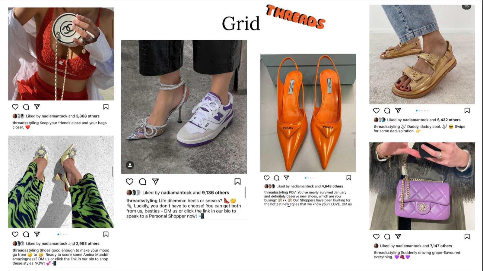 Social copy on grid posts and stories for all @Threadsstyling accounts across Instagram, TikTok and Snapchat.